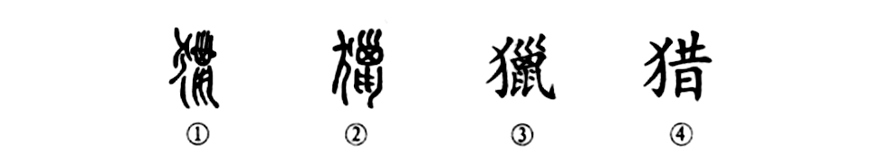“鷹鹯獵食,難免困急。”這個“獵”字為形聲字。①是金文的形體。左為“犬”,表意;右為“巤”,表聲。②是小篆的形體,與金文相似。③為楷書的寫法。④為簡化字。