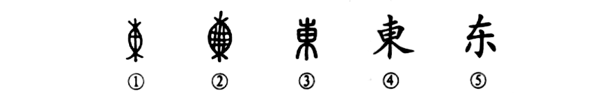 這是“東方欲曉”的“東”字。許慎曾根據小篆的形體分析說,這個字是“日”和“木”組合而成,“日”升到樹木的半中腰,表示東方。其實許慎說錯了。你看甲骨文①多像兩頭扎起來的一個大口袋。金文②就更像大口袋裝滿了東西,而兩端也是扎起來的樣子,所以“東”的本義就是代表“東西”(物)。小篆③是從金文演變來的,已經看不出是口袋的形狀了。④為楷書形體。⑤是簡化字,書寫很方便。