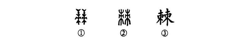 這是“荊棘叢生”的“棘”字,讀作jí,本為象形字。①是金文的形體,就是兩株酸棗樹,全身都長著刺。②是小篆的形體,與金文相似。③是楷書的形體。