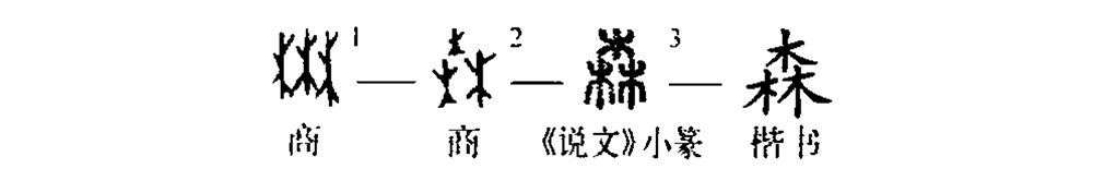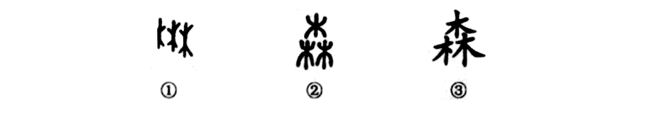 這個(gè)“森”字是個(gè)會(huì)意字。你看甲骨文①就是一排三棵樹的形象,這真是樹木叢生,森林茂密。②是小篆的形體,“林”上有“木”,這并非說樹上有樹,而是為了美觀和符合方塊結(jié)構(gòu)的要求。③是楷書的寫法,是由小篆直接演變而來。