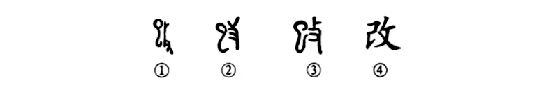 “琴瑟時(shí)未調(diào),改弦當(dāng)更張。”這個(gè)“改”字,本為會(huì)意字。①是甲骨文的形體。左邊為“巳”,實(shí)像人形:右邊為“攴”,一只手拿著鞭子打。郭沫若說:“殆象撲作教刑之意,子跪執(zhí)鞭以懲戒之也。”②是金文的形體,與甲骨文相似。③是小篆的寫法。④為楷書的寫法。