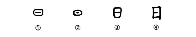 這就是“旭日東升”的“日”字。甲骨文①和金文②都像太陽的形狀。所以“日”是個象形字。③是小篆的形體,原來中間的一點則變成了一橫??瑫苁且佬∽男误w寫為方形。