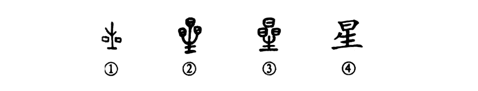 ,明雨,伐? 既雨。咸伐,亦雨? 施卯鳥星(晴)。” (《合集》11497正)金文作“曐”。從晶,生聲。戰國文字或作“星”字。《說文》:“曐,萬物之精,上為列星。從晶,生聲。一曰象形。從口,古口復注中,故與日同。”所說的“一曰”云云,顯然有誤。所以“星”本指群星,后也指單獨的星體。古代所說的“星”,包括今天所說的“恒星”、“行星”、“流星”、“彗星”等等。后也引申指“小的斑點”等等。今簡化為“星”。(王志平)