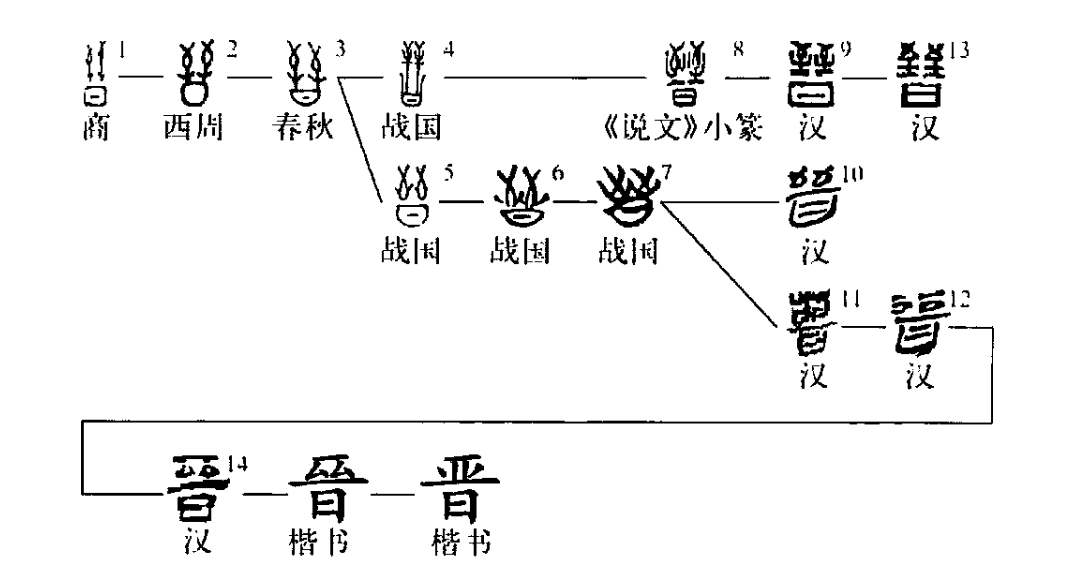 會意兼形聲字。初文從二“矢”,從日。后來二“矢”逐漸演變為“臸”字。甲骨文:“……晉扶……”(《合集》19568)古文字中多用為地名,指兩周時期的晉國。晉公盆:“晉邦維翰。”(《集成》16.10342)《說文》:“