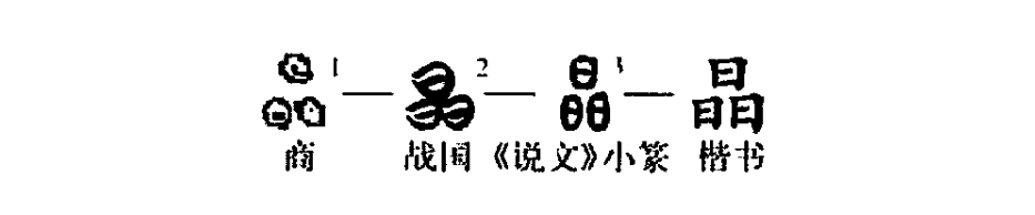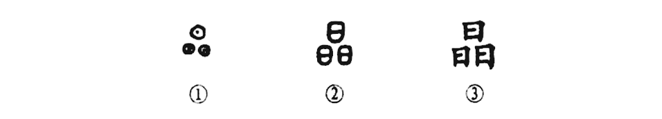 這是“亮晶晶”的“晶”字。甲骨文①的形體是三個太陽堆在一起。本來一個太陽就夠亮的了,那么三個太陽就更亮了,所以《說文解字》說:“晶,精光也,從三日。”這種三個同樣的字所組成的會意字,就叫“同體會意字”。小篆②和楷書③也是三個“日”字。所以“晶”字的本義是“光亮晶瑩”的意思。