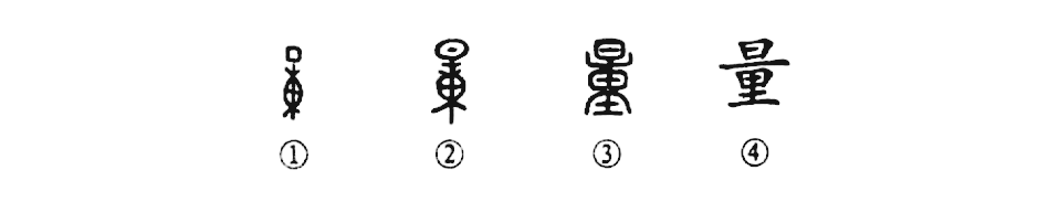 甲骨文構形有多種說法,何琳儀認為從“昜”從“東”,昜、東共享豎筆,“昜”是量的聲符。孫常敘認為不從“日”,所謂“日”形象囊袋的袋口,象張囊橐之口以量物之形,按此說與字形不合,“東”已象袋子上下兩端皆有束縛,故不能再象袋口。郭沫若認為此字是“亮”的古文,象太陽從東方升起,大放光明,按此說雖可從聲音方面說明“亮”與“量”的關系,但除音理之外,與“量”字的用義難以連系。甲骨文又有從“田”和從“束”之形,或不從“日”而從“子”形,所謂“子”形疑為筆畫增繁所致。