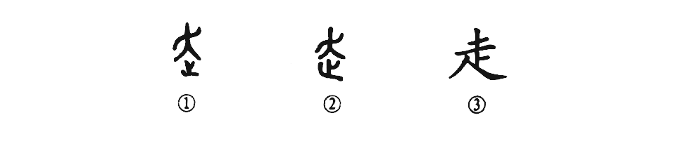杜甫的《石壕吏》詩:“老翁逾墻走,老婦出門看。”是說老翁跳出墻去慢慢地“走”了嗎?完全不是。你看金文①的上部是一個甩開兩臂的“人”形,下部是一只大腳(止),在跑呢!所以在古代“走”就是“跑”的意思。②是小篆的形體,上部的人形還在,只是下部的“止”不像腳形了。③是楷書的形體。