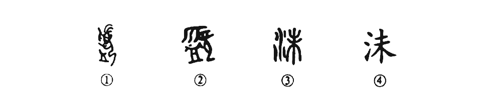這是個“沬”(huì會)字。從甲骨文①看得很清楚,右邊是面朝左彎著腰的一個人,左下部放著一個器皿,左上方是人的手,即用手捧水在洗臉洗頭。金文②也基本上是甲骨文的形象。可是到了小篆③就簡化成左形(水)右聲(未)的形聲字了??瑫芘c小篆的形體基本一致。