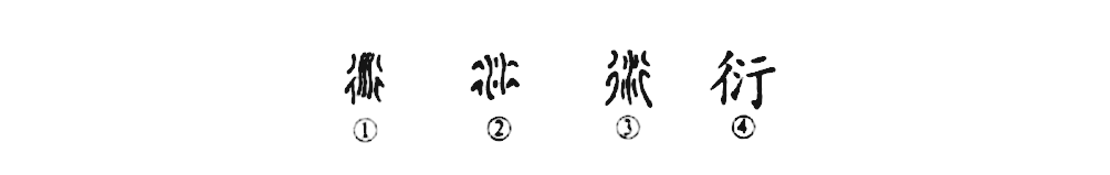 這是“流衍四方”的“衍”字,本為會意字。甲骨文①的外部是“行”字,中間為河川,表示川流不息之意。②是金文的形體,中間是河流之形。③是小篆的形體,中間變為“水”,但不管怎樣,長流水之意未變。④為楷書的形體,中間仍為“水”。