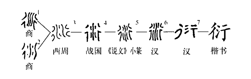 會意字。從水,從行。會水循河道流行之意。《說文》:“衍,水朝宗于海也。”王筠句讀:“案:字形,水在行中與‘洐’水在行外異,當是即形為義,乃《孟子》‘水由地中行’之說。”甲骨文或省從“彳”,水流多寡不定,形態各異,于義無別。至戰國,形體基本固定。漢隸將“水”寫成“氵”,沿襲至今。甲骨文“衍”,一期貞人名。“婦衍”,人名。戰國戈銘“廣衍”,地名。由“衍”之本義引申有溢出、富足等義。又,多用為推衍、演變等義。例不備舉。今“衍”字歸“彳”部。(王逸鶴)