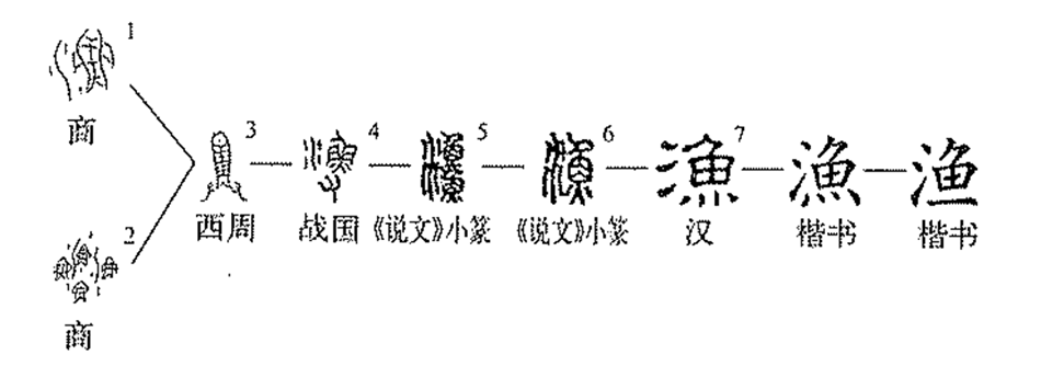“月落烏啼霜滿天,江楓漁火對愁眠。”這個“漁”字是會意兼形聲的字。說它是會意:左“水”右“魚”,是在水中捕魚之義。說它是形聲,左形(水)右聲(魚),是個形聲字。甲骨文①的右邊是“魚”,左邊是“水”。金文②的形體繁雜多了,不過會意的意味更濃,上部的左邊是“水”,上部的右邊是“魚”,下部是兩只大手,這就表明在水中“撈魚摸蝦”就叫“漁”。小篆③卻變得沒有多少意思了,因為把金文中的雙手換成一條魚,反而造成了書寫上的不便。④是楷書形體,比小篆少了一條魚,很有必要。⑤是簡化字。