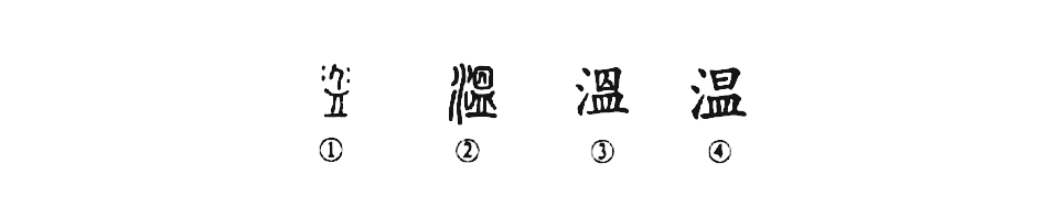 “漸覺一家看冷落,地爐生火自溫存。”這個(gè)“溫”字本為會(huì)意字。在甲骨文中,“溫”、“浴”很可能就是一個(gè)字。甲骨文①“人”旁的四個(gè)小點(diǎn)是水氣,像人在容器中洗身的樣子,所以有“溫”義。②是小篆的形體,左邊是“水”,右邊的形狀仍與洗浴有關(guān)。③是楷書異體字的寫法。④為楷書通行體,將“囚”改為“曰”,書寫方便。