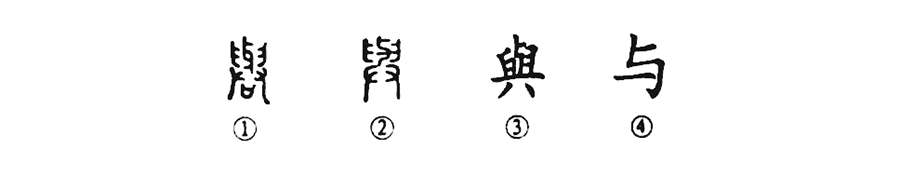“與為千金之裘,而與狐謀其皮。”這個(gè)“與”字本是會(huì)意兼形聲的字。①是金文。四角是四只手,中間是個(gè)“與”字,表音,下面的“口”,表示一個(gè)器物。其大意是一雙手交一件器物給另一雙手。②是小篆的形體,其下部省略了“口”。③是楷書的形體,直接由小篆演變而來。④是簡化字,只保留了楷書中的讀音部分,書寫時(shí)省事多了。