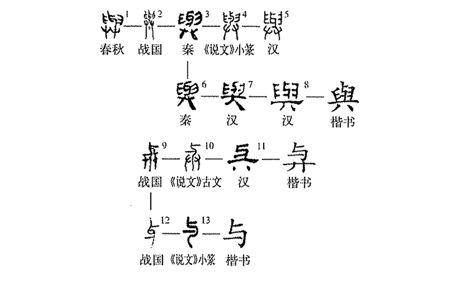 ”、“與”是繁簡字。《說文》釋“與”的本義是“黨與”,釋“與”的本義為“賜予也。一勺為與”,恐均非事實(shí)。但說“此與與同”是正確無誤的。“與”字從上下兩只手的“舁”,“舁”除了表示讀音之外,也可能兼表兩雙手間的相付予義,若此,則可理解為形聲字,本義即賜予。(李守奎)