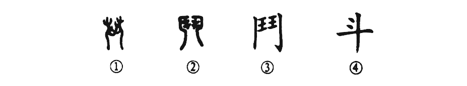 ?這是“斗爭”的“斗”字。甲骨文①是面對面的兩個武士,頭戴武士帽,伸著手互相搏斗。②是小篆的形體,變得不像人形了。③是楷書的寫法。④是簡化字。