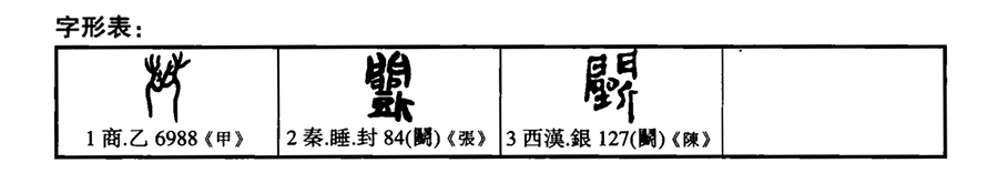 釋形:甲骨文象兩人徒手相鬥,互持對方頭髮之形(羅振玉《增考》中62頁)。睡簡“鬭”字所從“鬥”已與“門”形難以區分。