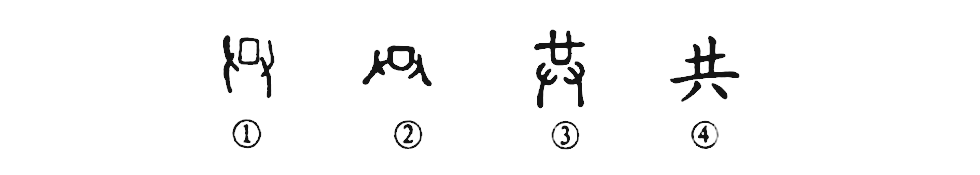 “但愿人長久,千里共嬋娟。”這個“共”字本為會意字。①是甲骨文的形體,像左右兩只手捧著一件物品。②是金文的形體,與甲骨文極為相似。③是小篆的寫法。④為楷書的寫法。