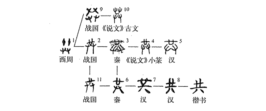 形聲字。從廿,??聲。 “廿”是兩個“十”并列,戰國文字連為一體。以兩個“十”表示共同之意。《說文》說“共,同也。從廿??”,是合乎古文字的實際的。我們以為“??”在這里主要是表意作用?!墩f文》古文當是由“共”逐步演變而來,而不是《說文》家所說的從四手。古文字中另有字形作如下形體: