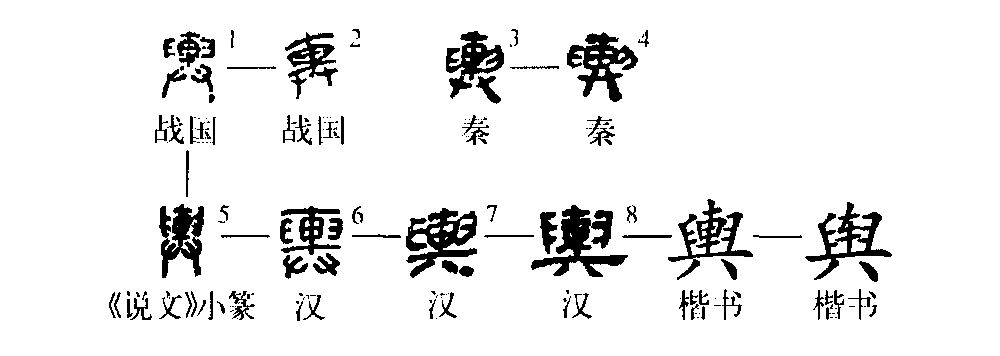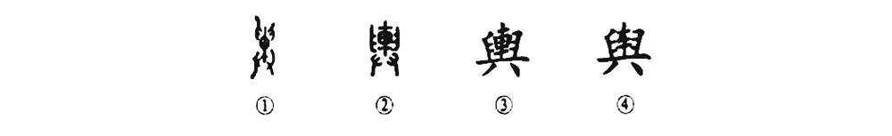 這個(gè)“輿”字是個(gè)會意字。甲骨文①的四角是四只手,中間是一件東西,這就表明四只手共舉一件東西。②是小篆的形體,中間部分變?yōu)?ldquo;車”形。③是楷書形體,直接由小篆演變而成。④為楷書簡化字。
